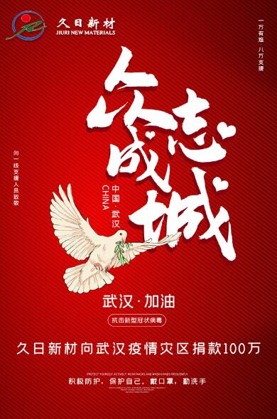 In 2020, Covid-19 ravaged Wuhan City and spread throughout China, and a "Battle of Pandemic Prevention and Control" has been fought in China to stop the spread of the pandemic! Facing the immediate outbreak, Tianjin Jiuri New Materials Co., Ltd. ( hereinafter referred to as ¡°Jiuri New Materials¡±) positively responded to the policy decisions of the Central Committee and Tianjin Municipal Party committee. While making sure that the Company and the employees are well protected, Jiuri New Materials also actively got involved in the battle of epidemic prevention and control , by helping the affected areas with rapid deployment, which has showed the social responsibility of a public company by practical action. On January 31, 2020, Jiuri New Materials (688199) donated 1 RMB million to the affected areas of Wuhan through Tianjin Charity Association for COVID-19 prevention and treatment in Wuhan.