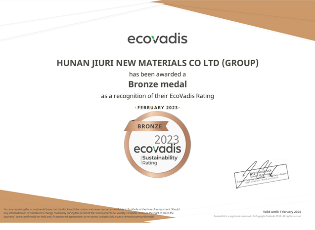 Hunan Jiuri (HUNAN JIURI NEW MATERIALS CO., LTD) successfully passed the Ecovadis evaluation and have been awarded a bronze certification.