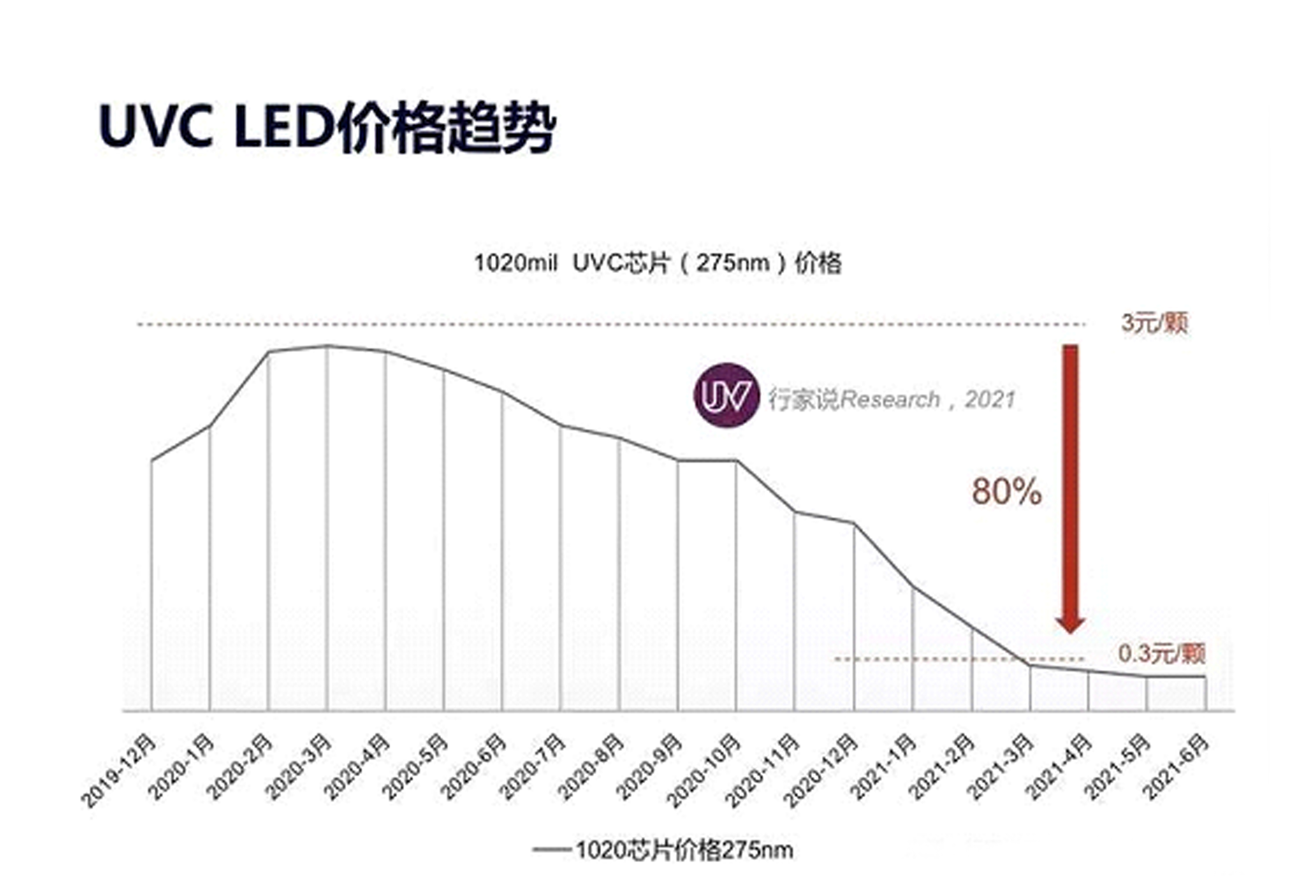 2019ÄêÒßÇ鱩·¢ÖÁ½ñUVC LEDÔÚÏû¶¾·½ÃæÕ¹ÏÖ³öÆäÆæÌØµÄÓÅÊÆ£¬¸÷´óоƬ¡¢·â×°³§¼ÒÒ²ÔÚ²»Í£µØÍƳöвúÎµ«ÓÉÓÚרÀûºÍ²úÁ¿µÄÔÒòÏà¶ÔÓÚUVA LEDоƬµÄ³É±¾ÕվɱÈÁ¦¸ß¡£È»¶ø¡¶Ë®Ù¶ÌõÔ¼¡·µÄÉúЧÕýÔÚ¼ÓËÙ¹¯µÆµÄÌÔ̽ø³Ì£¬¶ø UVC+UVA LED ¾ÍÊÇ×î¼ÑµÄÑ¡Ôñ£¡ÏÈÀ´¿´¿´UVC LEDµÄÇé¿ö¡£ÒÔ275nmµÄ1020milоƬΪÀý£¬½ØÖÁ6ÔÂÊý¾Ý£¬UVC LEDоƬ¼ÛÇ®½µ·ù½ÏÒßÇéÆÚ¼ä×î¸ßµãϽµ³¬80%£¬Êг¡ÖÐλÊýÒѾµøÆÆ0.5Ôª/¿Å£¬µÍÁÁ°æÒѾ´¦ÓÚ0.3-0.4Ôª/¿Å£¬¶Ô±ÈÒßÇéǰ£¨2019Äê¼ÛÇ®£©£¬Ò²ÓÐÔ¼70%µÄϽµ·ù¶È¡£ÏàÐÅËæ×ÅUVCÔÚɱ¾úÁìÓòÓ¦ÓõIJ»Í£À©´ó£¬Ïà±ÈÏÖÔڵijɱ¾»áÓкܴóµÄ¸ÄÉÆ£¬¹â¹Ì»¯¼¼Êõµ½Ê±ºò¾Í¿ÉÒÔÕæÕýµØÊµÏÖUVC+UVB+UVAÌæ´úÏÖÓеĹ¯µÆ¹âÔ´¡£